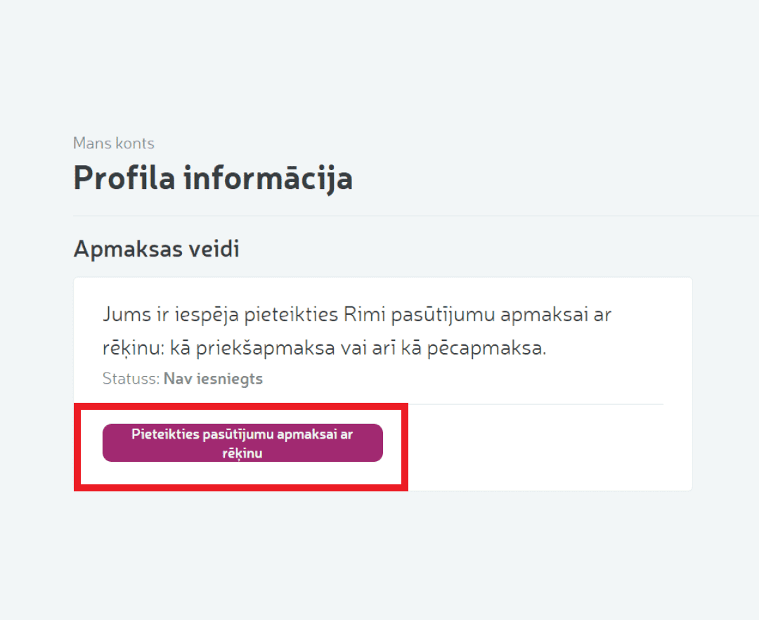Savā profilā varat pieteikties pēcapmaksai, spiežot pogu “Pieteikties pasūtījumu apmaksai ar rēķinu”Tas dos iespēju saņemt rēķinus ar kompānijas rekvizētam un veikt apmaksu 14 dienu laikā pēc produktu piegādes.