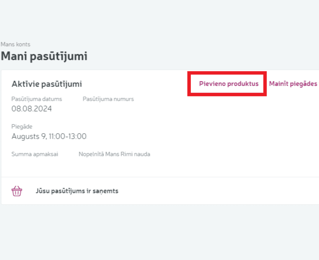 Autorizējoties e-veikala lapā, savā profilā, sadaļā "Mani pasūtījumi" būs redzami pasūtījumi, kurus iespējams papildināt. Ja opcija par papildināšanu pie pasūtījuma nav aktīva, esam sākuši pasūtījuma komplektēšanu un tā papildināšana vairs nebūs iespējama.Papildināt pasūtījumu iespējams, tikai, pievienojot papildu preces. Noņemt preces pašlaik nav iespējams.