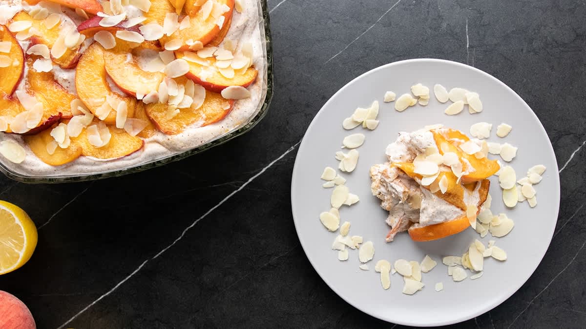 👨🍳Traukā kārto cepumus. Pāri lej saldo krējumu, liek persikus un pārkaisa ar mandeļu skaidiņām. Visu atkārto 3 reizes.