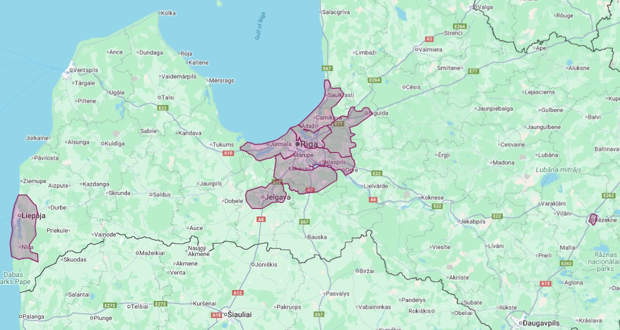 Karti ar piegādes zonu vari apskatīt augstāk, kā arī, izvēloties pirkumu saņemšanas veidu un spiežot uz "Piegāde uz adresi".