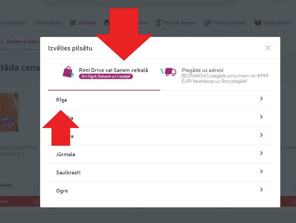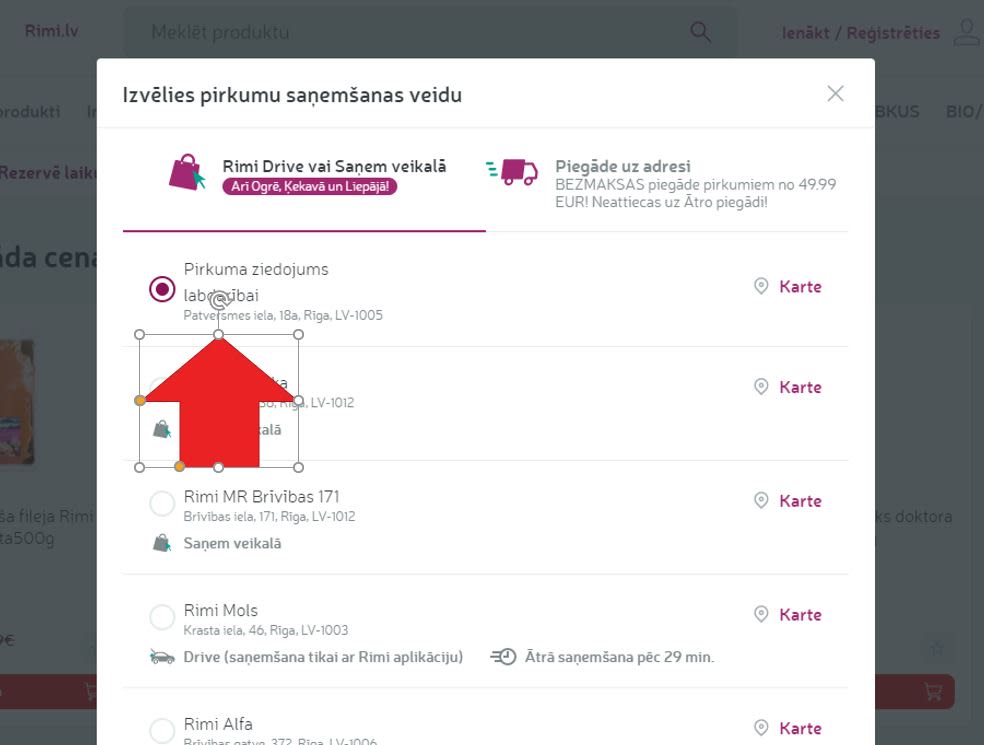 no piegādes veidiem izvēlies "Rimi Drive un Saņemšanas punkti",