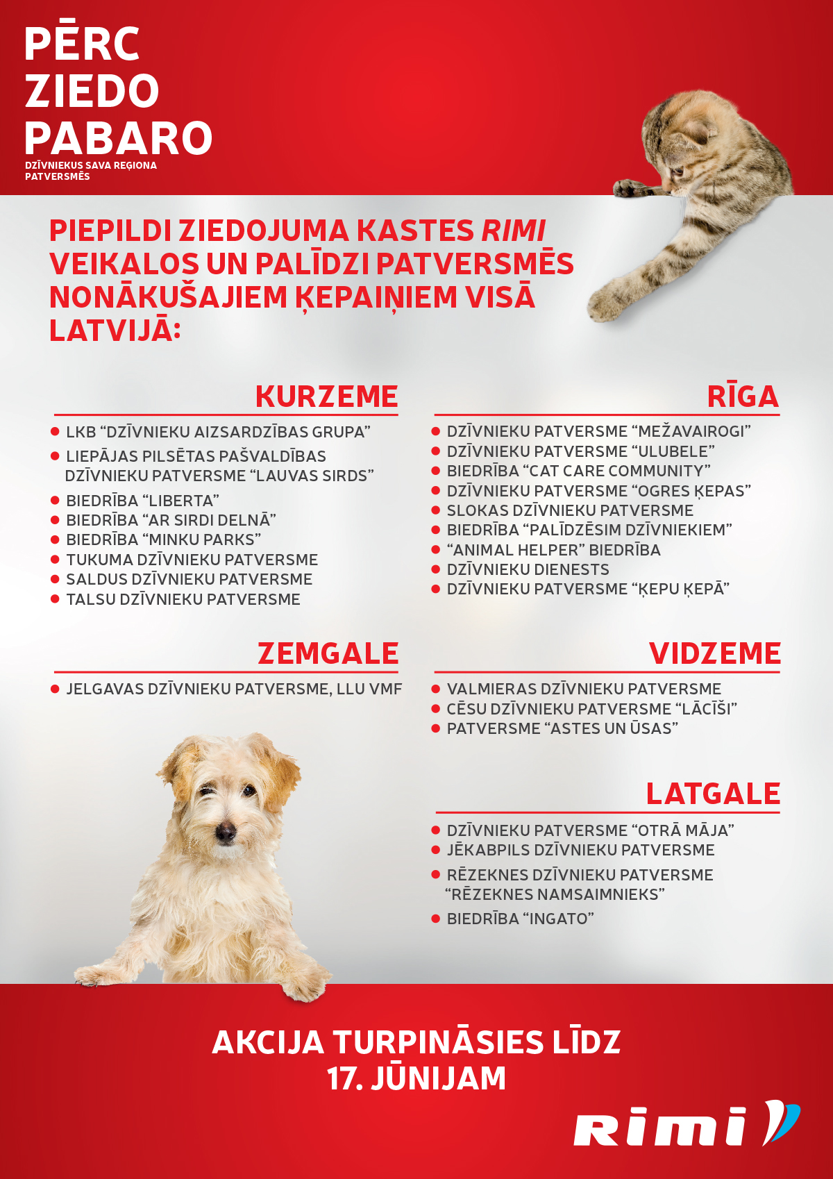 “Iepriekšējās iPērc, ziedo, pabaro akcijās esam saņēmuši lielu pircēju atsaucību un desmitiem tonnu dzīvnieku barības. Esam gandarīti, ka līdzcilvēki nav vienaldzīgi, un ceram uz vēl labāku rezultātu šoreiz, mūsu ceturtajā kampaņā. Dzīvnieku barība, kaķu smiltis, rotaļlietas – mazie draugi 25 dzīvnieku patversmēs visā Latvijā būs pateicīgi par ikvienu ziedojumu,” aicina Rimi Latvia sabiedrisko attiecību vadītāja Dace Preisa.