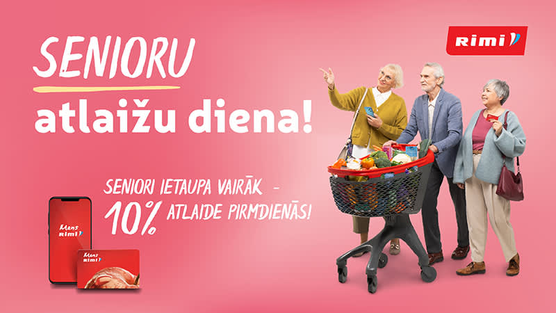 Katru pirmdienu Rimi veikalos un e-veikalā senioriem ar Mans Rimi karti atlaide pirkuma grozam 10%. Papildus informācijai aicinām zvanīt Rimi klientu servisa centram pa tālruni 80000180 vai rakstīt info.lv@rimibaltic.com.