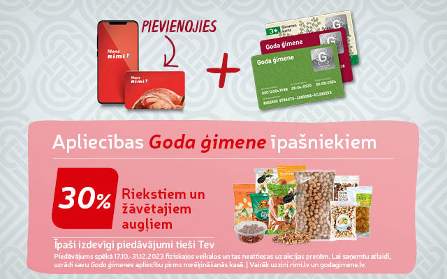 Apliecības Goda ģimene īpašniekiem 30% atlaide riekstiem un žāvētajiem augļiem. Piedāvājums spēkā 17.10.-31.12.2023. fiziskajos veikalos un tas neattiecas uz akcijas precēm. Lai saņemtu atlaidi, uzrādi savu Goda ģimenes apliecību pirms norēķināšanās kasē.