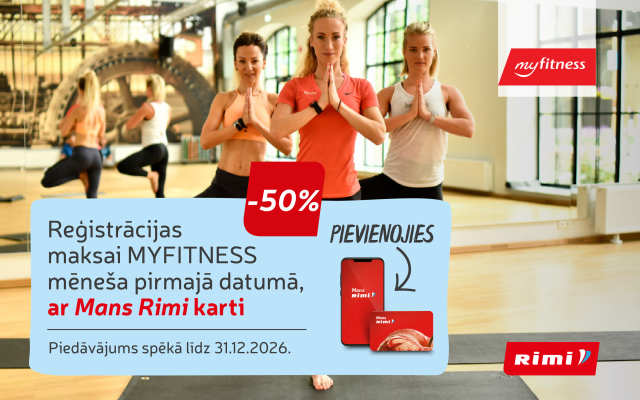 Kļūsti par MyFitness sporta kluba biedru! Ar Mans Rimi karti katra mēneša pirmajā datumā reģistrācijas maksai 50% atlaide! Reģistrējies klubā vai www.myfitness.lv.