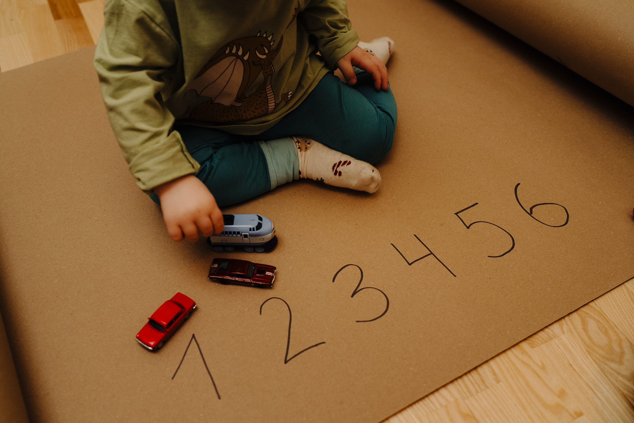 Uz lielas papīra loksnes uzrakstiet ciparus no 1 līdz 6 (vai vairāk, atkarībā no bērna prasmiēm). Aiciniet bērnu izvietot pretī katram ciparam atbilstošu skaitu rotaļu automašīnu vai vilcienu vagonu. Piemēram, pretī ciparam “1” – viena mašīna, pretī “2” – divas. Tas palīdz vizualizēt cipara vērtību un sasaistīt simbolu ar konkrētu priekšmetu daudzumu.