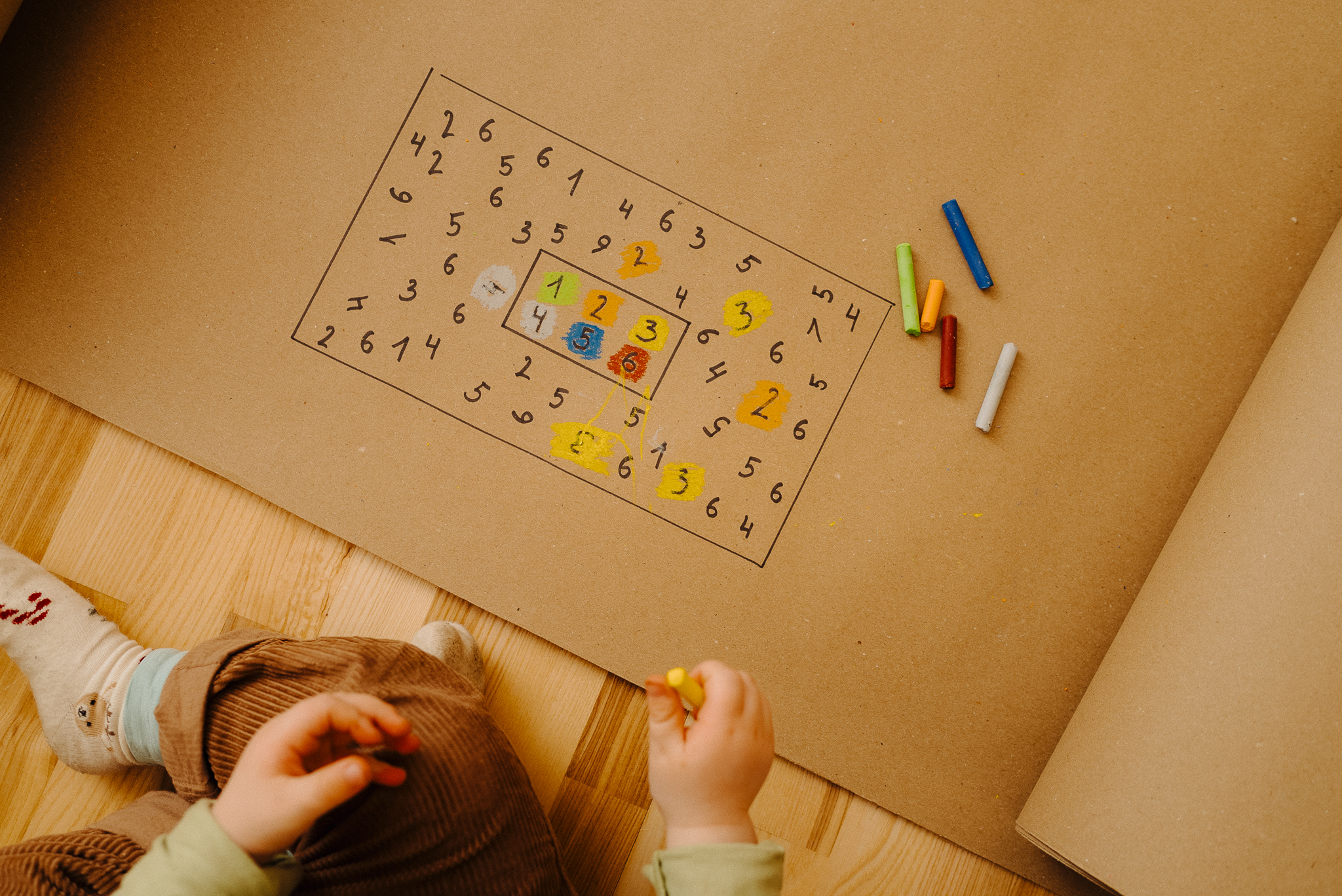 Sagatavojiet lapiņu ar daudziem, nejauši izmētātiem cipariem rāmī. Centrā izveidojiet “špikeri”, kurā katrs cipars ir iekrāsots savā krāsā (piemēram, 1 – zaļš, 2 – dzeltens, 5 – zils, 6 – sarkans). Bērna uzdevums ir atrast lielajā rāmī visus vienādos ciparus un iekrāsot tos ar atbilstošo krītiņu. Šī spēle lieliski trenē vērību un palīdz atpazīt ciparu grafisko attēlu.