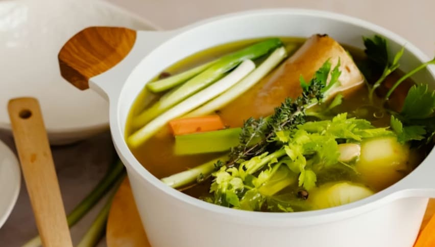- Apceptos dārzeņus un kaulus liek katlā un pārlej ar aukstu ūdeni tā, lai tie būtu pilnībā nosegti.