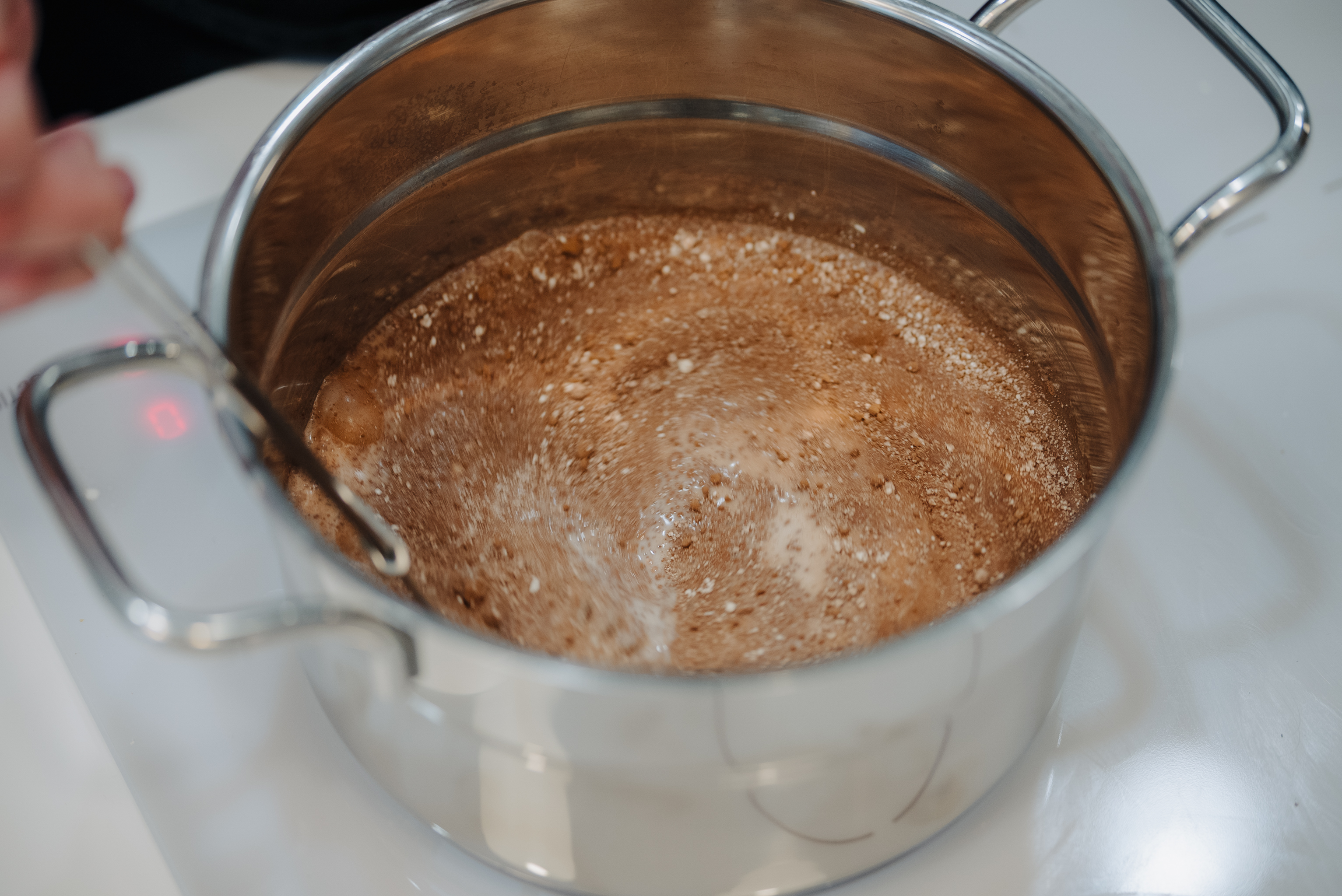 - Pievieno atlikušo pienu un lēnām karsē, nepārtraukti maisot.