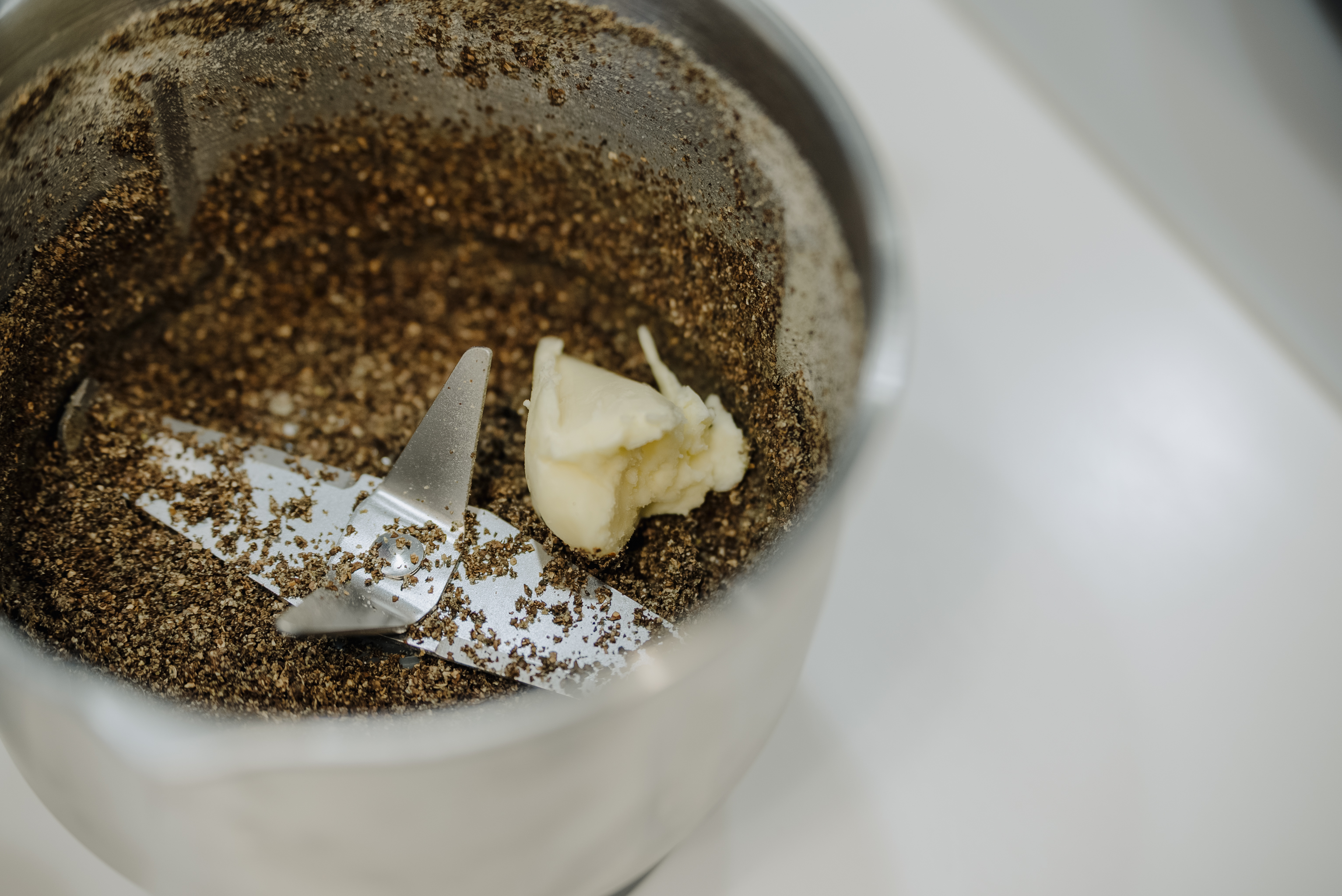 - Sasmalcina piestiņā vai blenderī, pievieno sviestu, sāli un samaisa viendabīgā masā.
