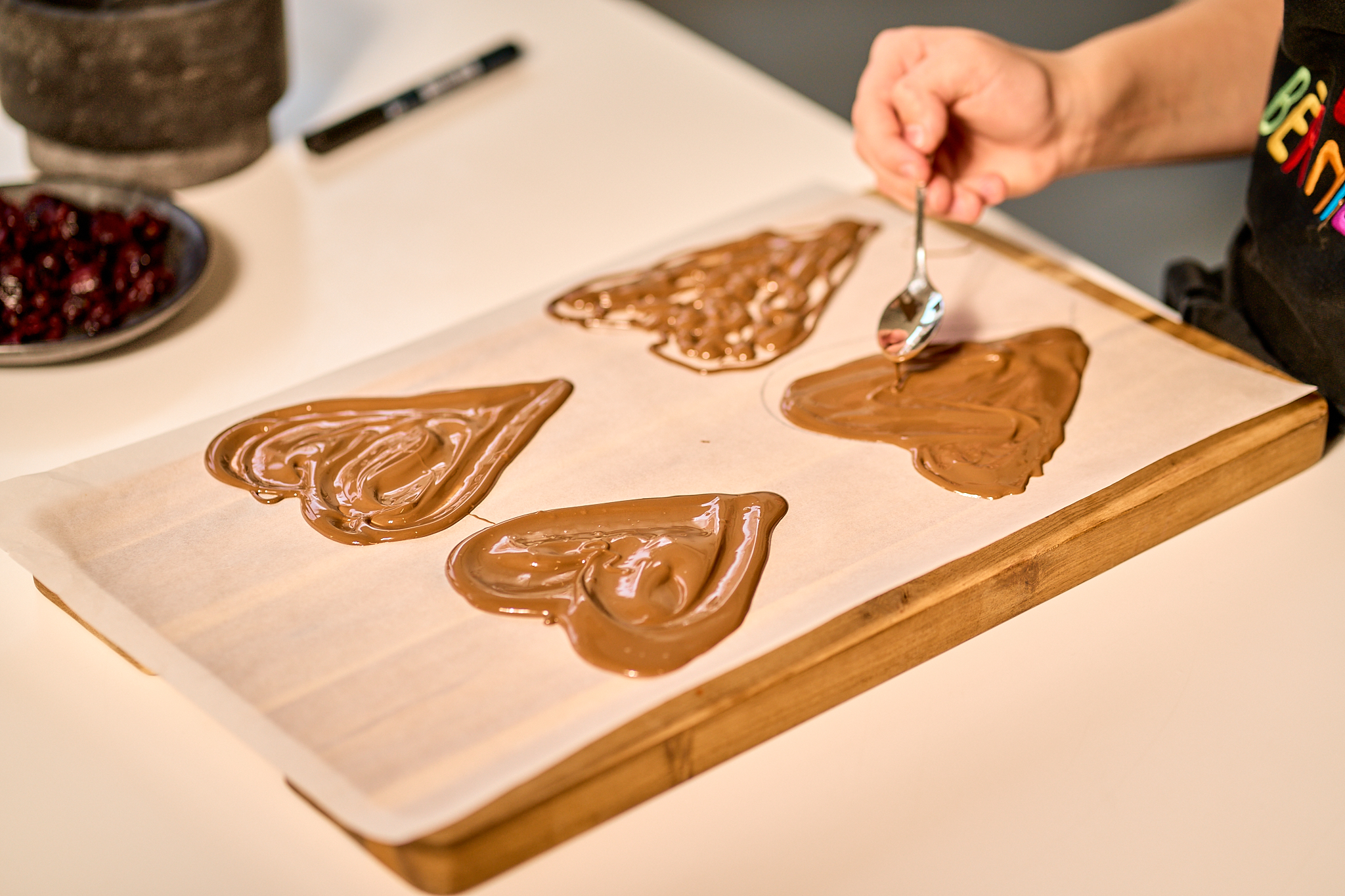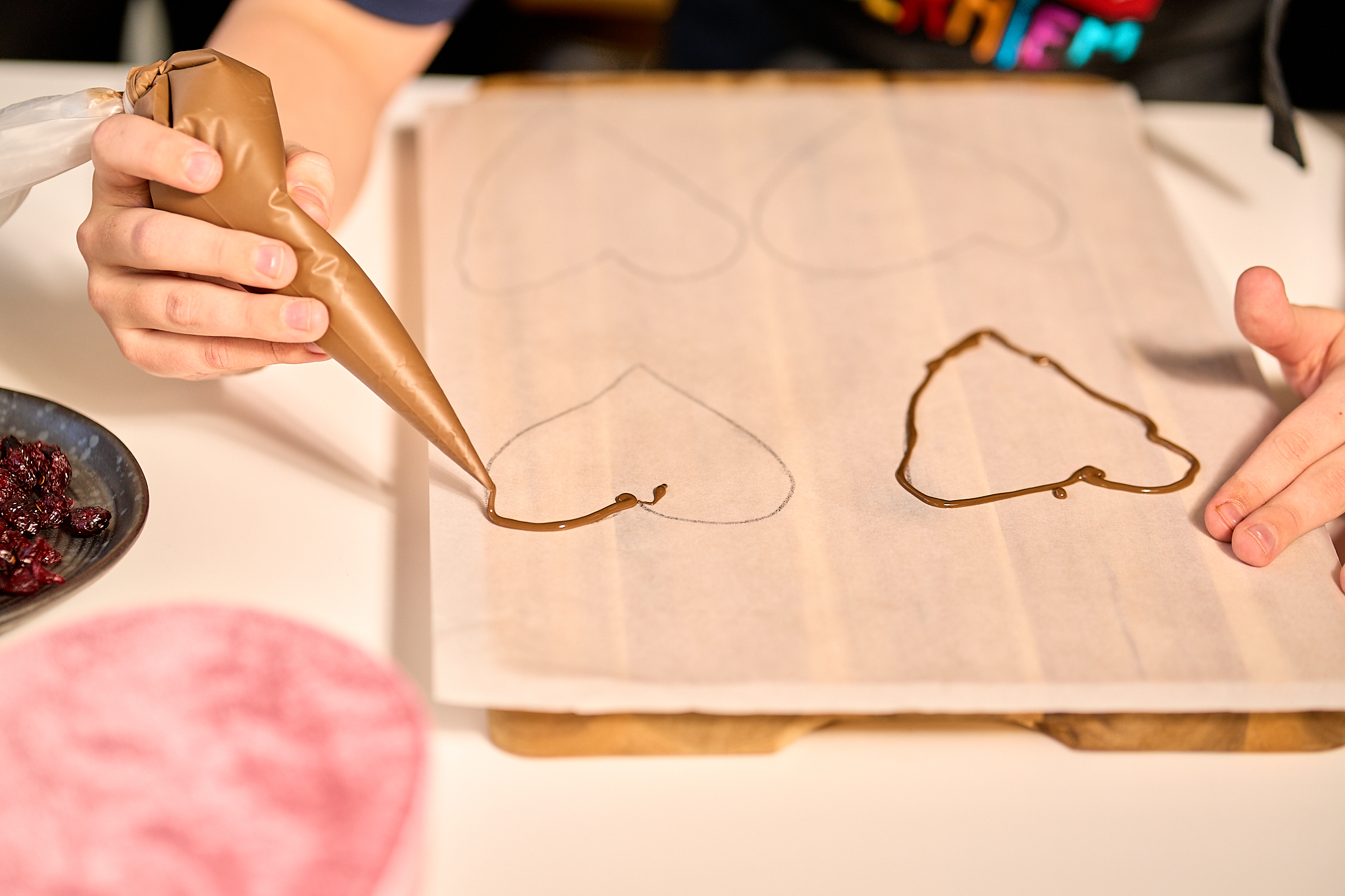 3. Uz cepamā papīra uzzīmē sirds formu ar flomāsteru, tad apgriež papīru otrādi un pa līnijām zīmē sirdi ar šokolādi.