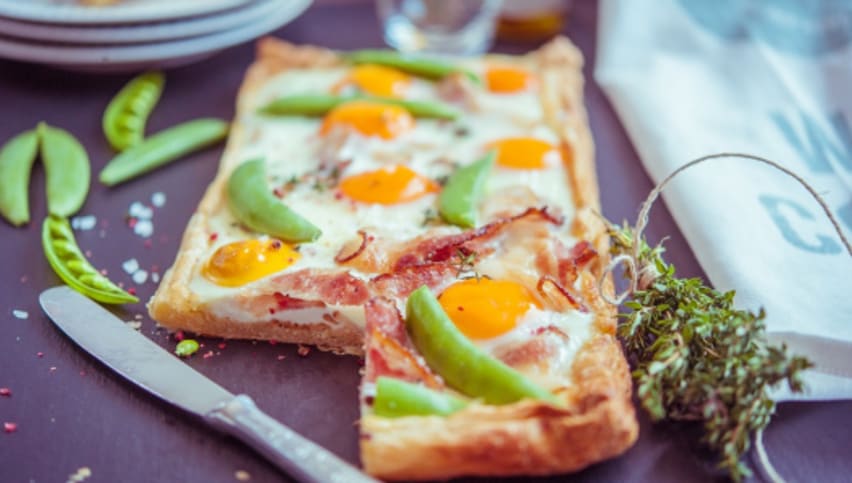 Sakarsē cepeškrāsni līdz 220 °C. Atkausē mīklu. Mīklas plāksnes savieno kopā un izrullē vienā garā mīklas plātī. Izrullēto mīklu liec formā un cep cepeškrāsnī 10 minūtes. Uz pannas apcep bekonu ar timiānu. Izceptās mīklas formā liec bekona šķēlītes, pākšu zirņus, pievieno olas. Cepeškrāsnī samazini temperatūru līdz 160 °C un cep plātsmaizi, kamēr tā gatava (aptuveni 7 minūtes).