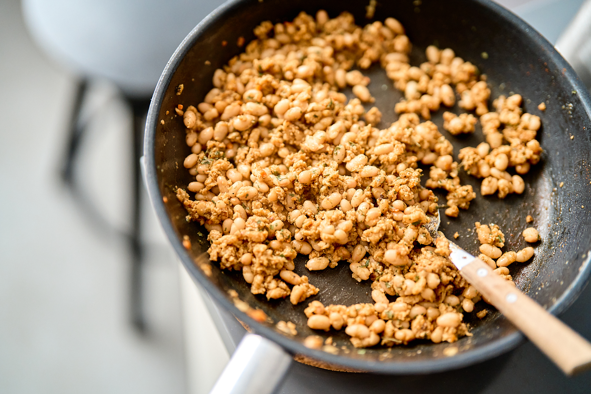 - Pievieno pupiņas, apmaisi un uzkarsē vēl pāris minūtes.
