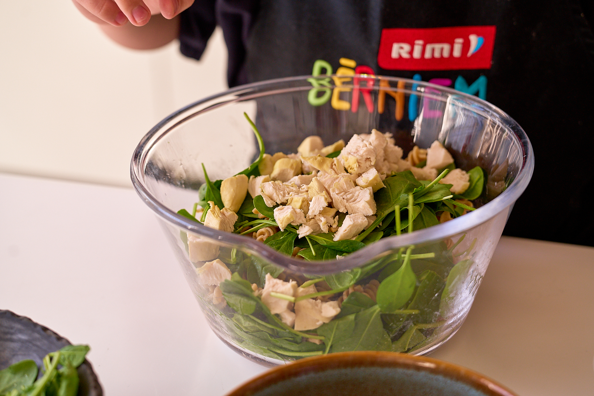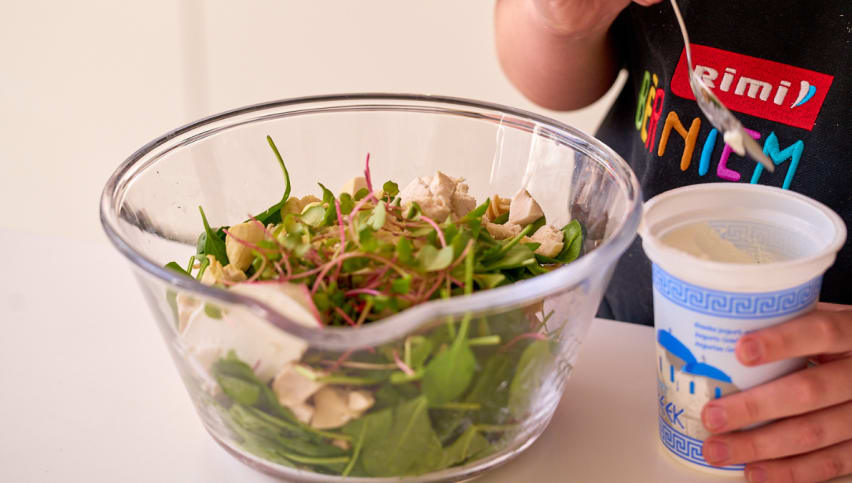 - Pievieno vistas gabaliņus un jogurtu.