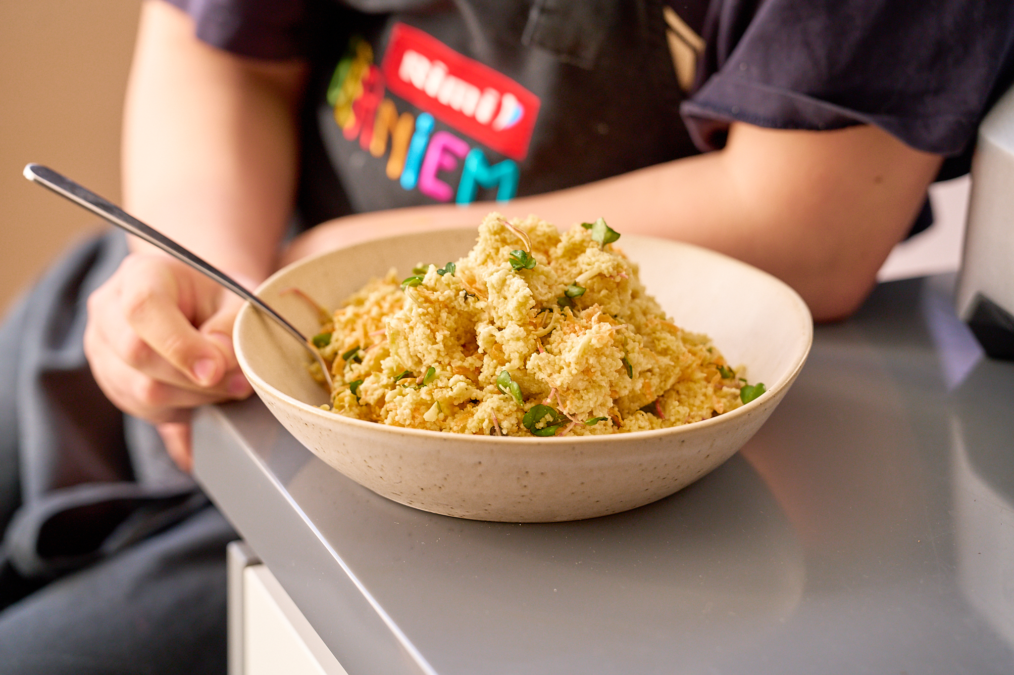 Pilngraudu kuskusa salāti ar redīsu dīgstiem un sieru