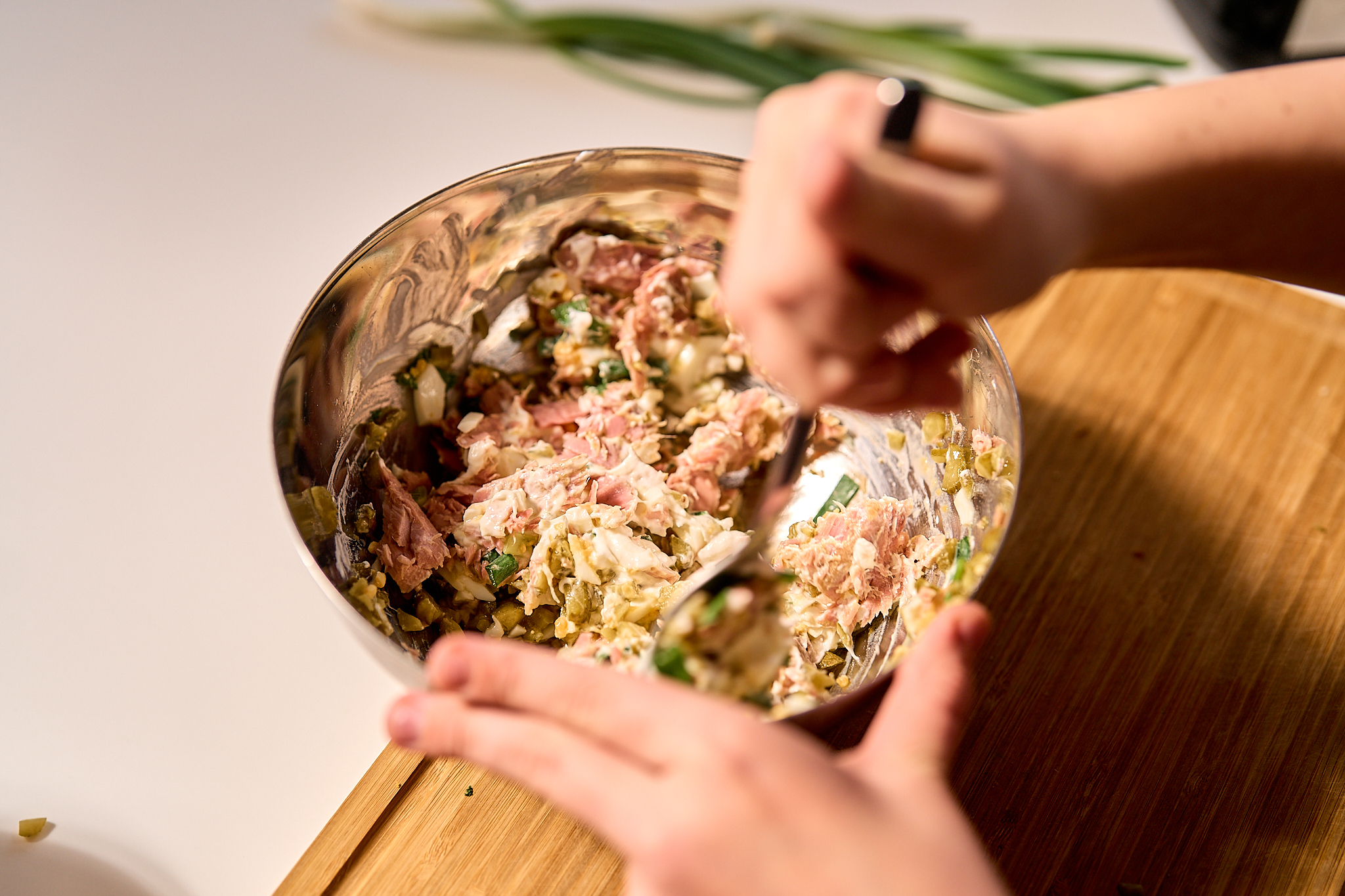 3. Smalki sagriež sīpolu, gurķi un olu, iemaisa tunča masā.
