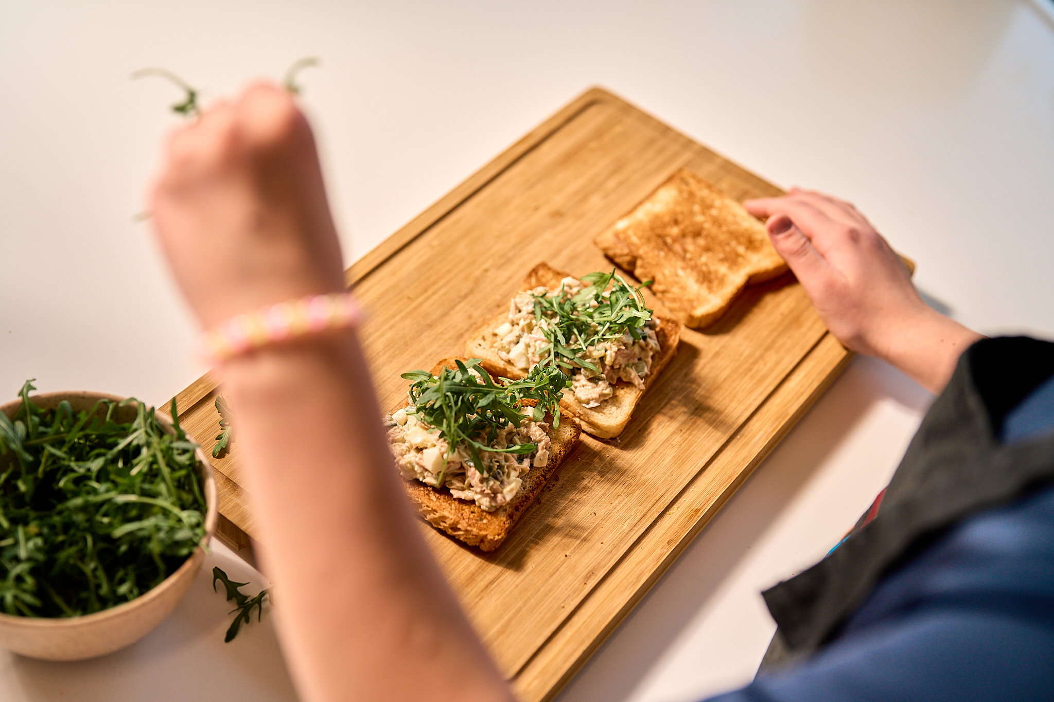 4. Maizi viegli apgrauzdē pannā vai tosterī. Uz maizes liek salātlapas un tunča masu.