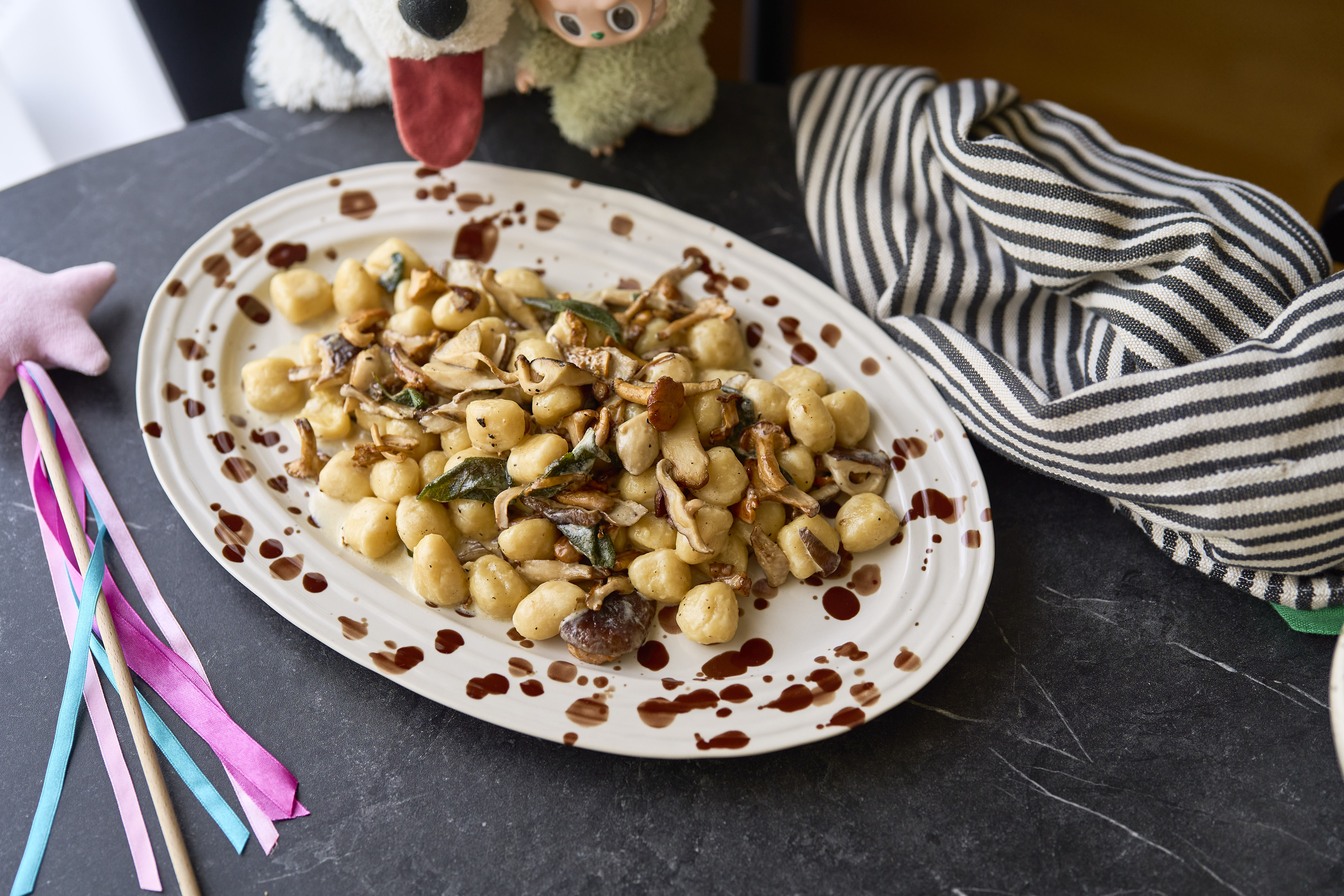 - Citā katlā novāra kartupeļu klimpas un pievieno sēnēm. Pielej saldo krējumu un pavāra vēl dažas minūtes, līdz viss ir gatavs.