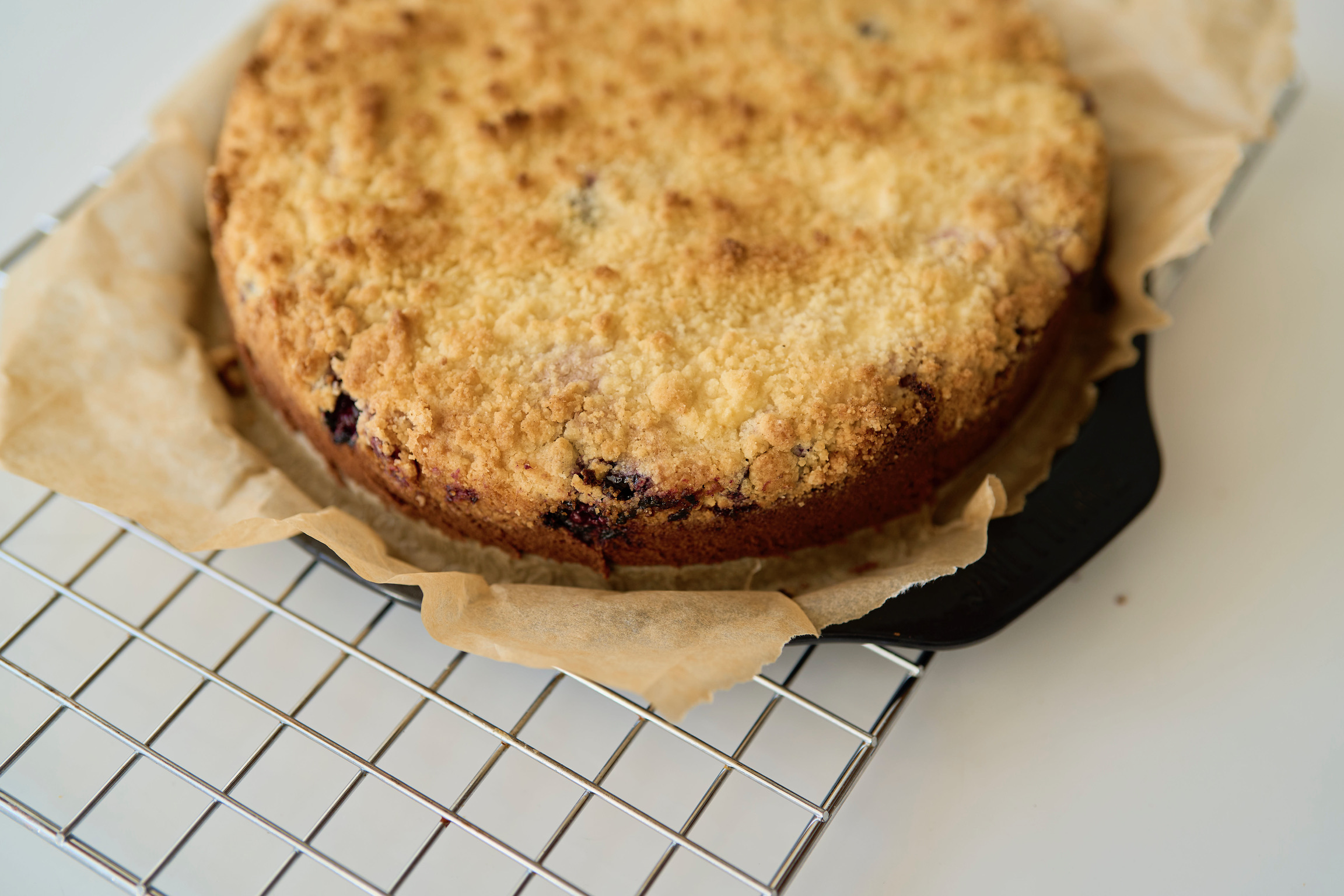 - Aukstu sviestu sadrupina ar cukuru un miltiem, drumstalas pārkaisa kūkai.