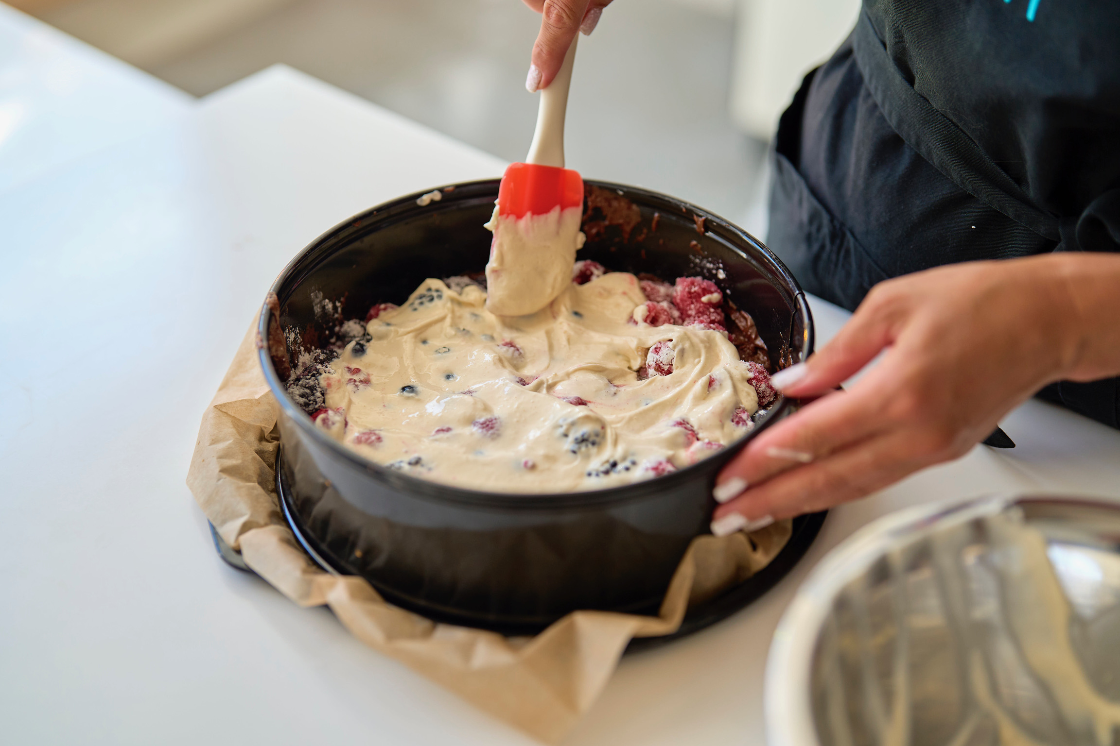 - Krēmsieru sakuļ ar olu, pārlej ogām.