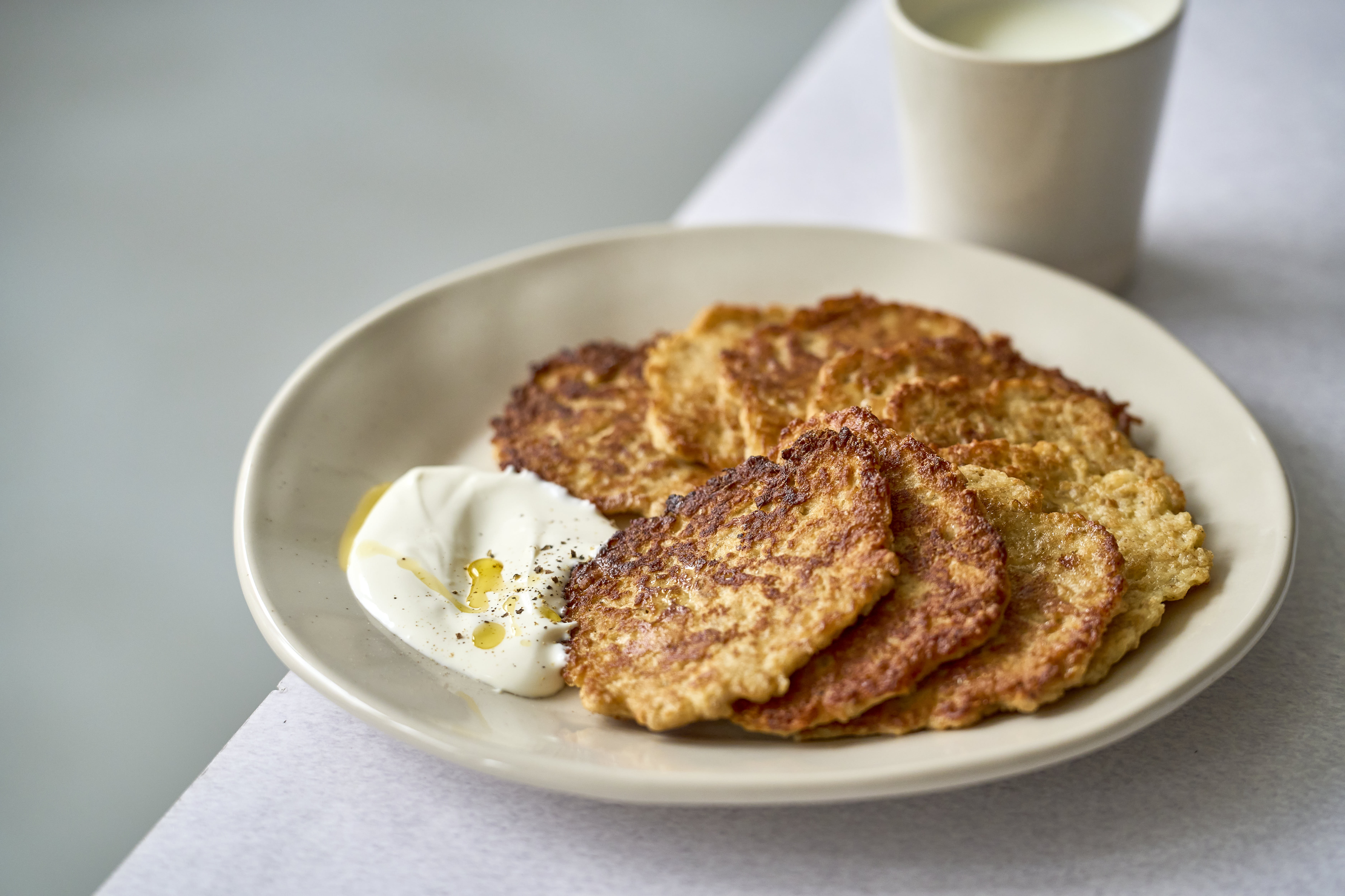 3. Var cept kā vienu lielu pankūku, uzliekot pannai vāku, vai kā mazas pankūciņas. Ja cep lielas pankūkas, to var salocīt uz pusēm un pasniegt ar grieķu jogurtu vai krējumu un svaigiem dārzeņiem.